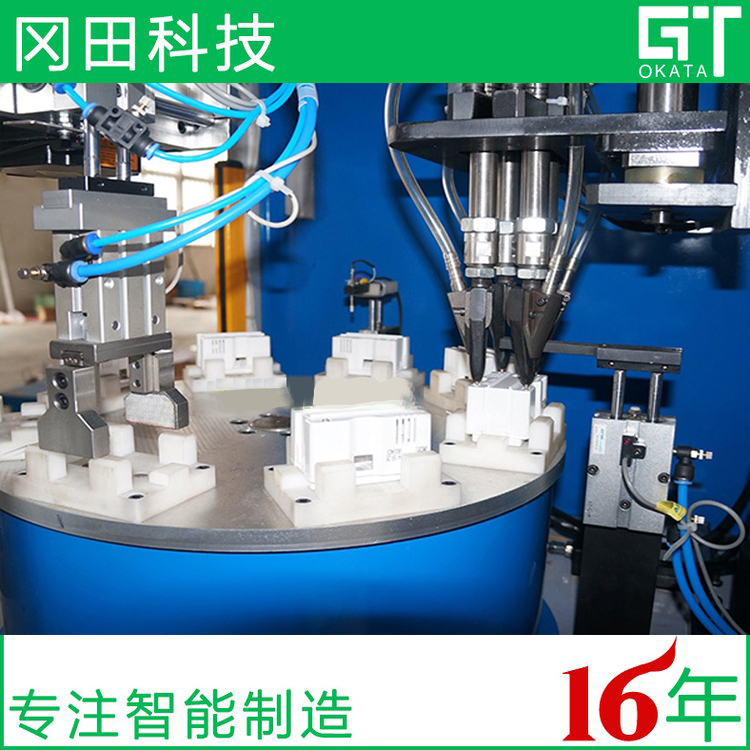 振動盤與裝配中心之間均設有傳輸軌道,裝配中心包括轉動盤,在轉動盤上設有零件定位孔的裝配夾座,轉
