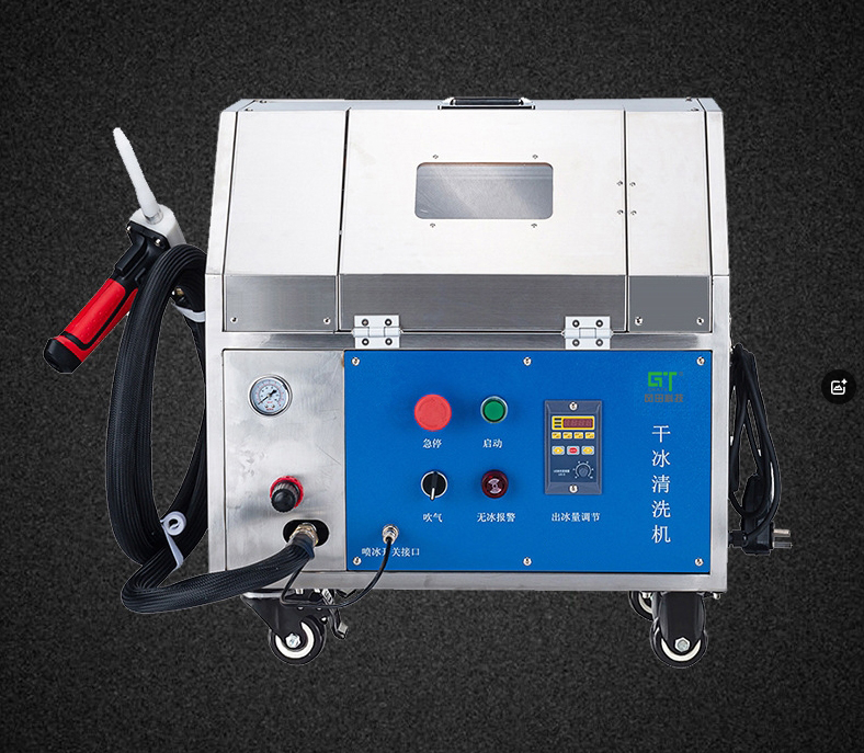 與噴鋼砂,噴玻璃砂,噴塑料砂和噴蘇打相似,干冰噴射介質干冰顆粒在高壓氣流中加速,沖擊要清洗的表面。