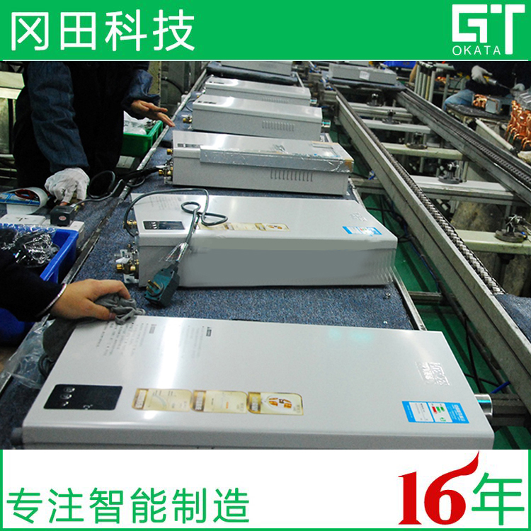熱水器組裝線主要由鏈板輸送線組成,鏈板輸送機的輸送面平坦光滑,摩擦力小,可以安全且游刃有余地輸送熱水器配件并進行組裝。